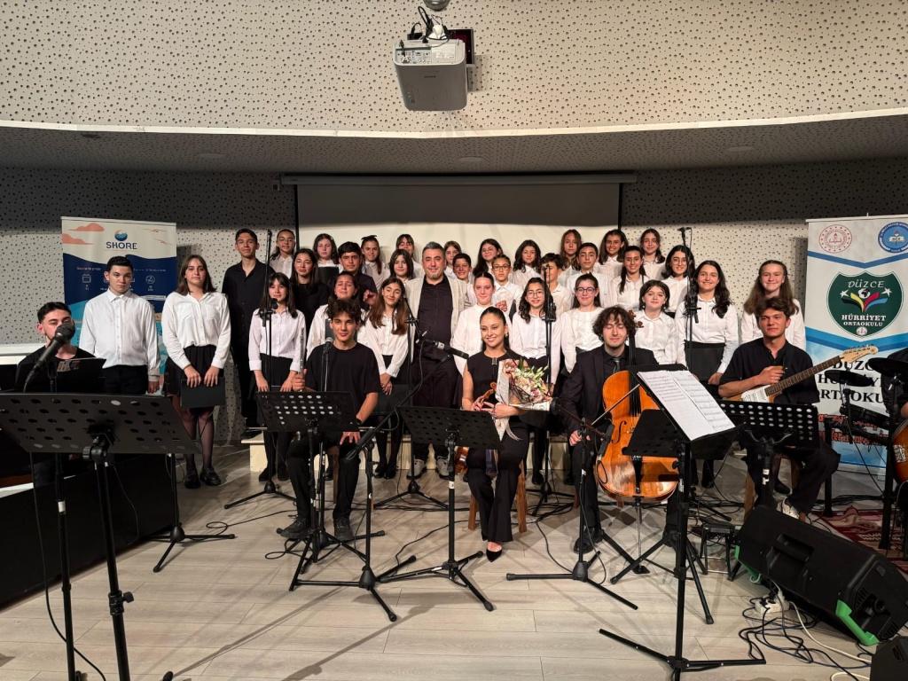 Gecenin en coşkulu anları ise Müzik Öğretmenimiz Ahmet Emre Esen yönetimindeki proje koromuzun ve müzik grubumuzun sahne almasıyla yaşandı. Koromuz, proje için besteledikleri özgün şarkıyı ve diğer eserleri seslendirerek dinleyicilerden büyük alkış aldı. Bu muhteşem gecenin gerçekleşmesinde emeği geçen başta sevgili öğrencilerimize, onlara her zaman destek olan siz değerli velilerimize, tüm proje ekibi öğretmenlerimize, bizlere ev sahipliği yapan Düzce Teknopark yönetimine ve projemizin hamisi olan SHORE programı ile Avrupa Birliği'ne sonsuz teşekkürlerimizi sunarız.